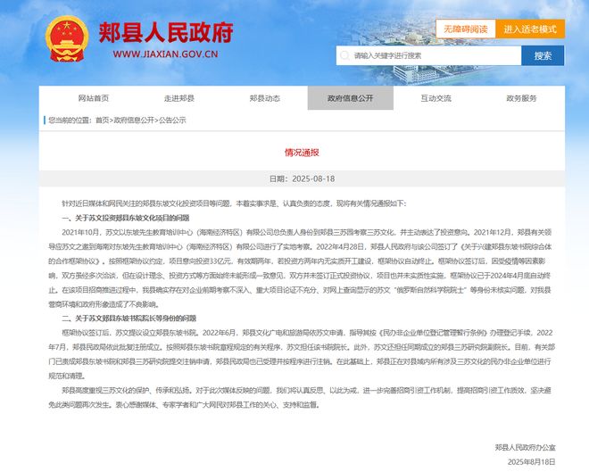 该照片显示了官方网站的屏幕截图。 With respect to the issue of Donpo’s cultural investment in Diaxiac County, where the media and Internet users have recently informed a realistic and serious responsible attitude and the related circumstances as follows: in October 2021, his wen went to the garden of Sansu in Jiaxian and went to Dongpo Education and Training Center (Hainan Economic Zone) Ltd. He left as general manager of the general culture of the general culture of the general culture of culture of Sansu and its investment investment意图。 2021年12月,贾县的相关领导人于2022年4月28日由DONPO教育和培训中心(海南生态化公司(Hainan Ecomication and Co.(Hainan Ecomication区)公司(海南)公司(Hainan Co. Hainan)公司(Hainan)公司(Hainan)公司。投资者确实如此框架协议将在两年内不开始施工,将自动结束。签署框架协议后,由于趋势和其他因素的影响,两党已经进行了多次谈判,但从未就设计概念,投资方法等达成共识。当事方尚未签署正式投资协议,并且该项目基本上没有实施。框架协议自动于2024年4月底结束。在鼓励对该项目进行投资的过程中,我们的县基于在线环境中的事件,包括在早期阶段缺乏对公司的详细检查,不适当地证明了重要的项目和不验证苏联身份。 2。在就齐亚县Donpo学院校长的身份签署了框架协议后,斯温提议在齐亚县的Donpo Academy提议。 2022年6月,文化办公室E,贾亚县的电台,电影院和旅游业导致他们根据“关于未使用的私人单位的注册和管理的临时法规”,批准了注册程序。 2022年7月,贾县民事事务局据此批准了注册和建立。贾县(Jia County),他在那里担任学院院长。根据Dongpo Academy Charter中建立的相关程序。此外,他的WEN曾担任贾县Sansu研究所的副主任,并同时成立。目前,相关部门已下令提交取消请求的Jia县Donpo Academy和Jia Sansch County Institute,即Jia County民事事务办公室已接受并取消了程序。据此,标准化的贾县并清洁了包括互换之间的所有私人单位,包括圣在县内的苏文化。贾县(Jia County)非常重视保护,继承和促进Sansu文化。关于当前媒体所反映的问题,我们将认真反映它们,并将其视为进一步提高投资促进工作机制,提高投资促进工作的质量和效率的警告,并果断地避免返回的问题。我们要感谢媒体,专家,学术界和互联网用户的疑虑,jiaxian工作的支持和监督。 JIA县政府办公室2025年8月18日来源:JIA县人民政府